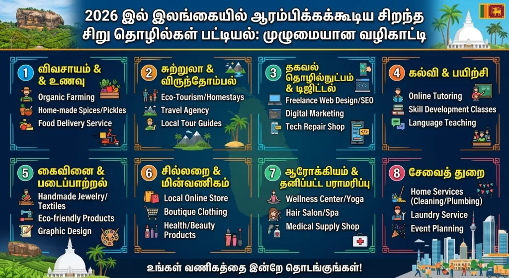 2026 க்கான இலங்கையின் சிறந்த சிறு தொழில்கள் பட்டியல் இங்கே. 20+ சிறு தொழில்கள் மற்றும் business opportunities in sri lanka பற்றிய முழுமையான வழிகாட்டி.