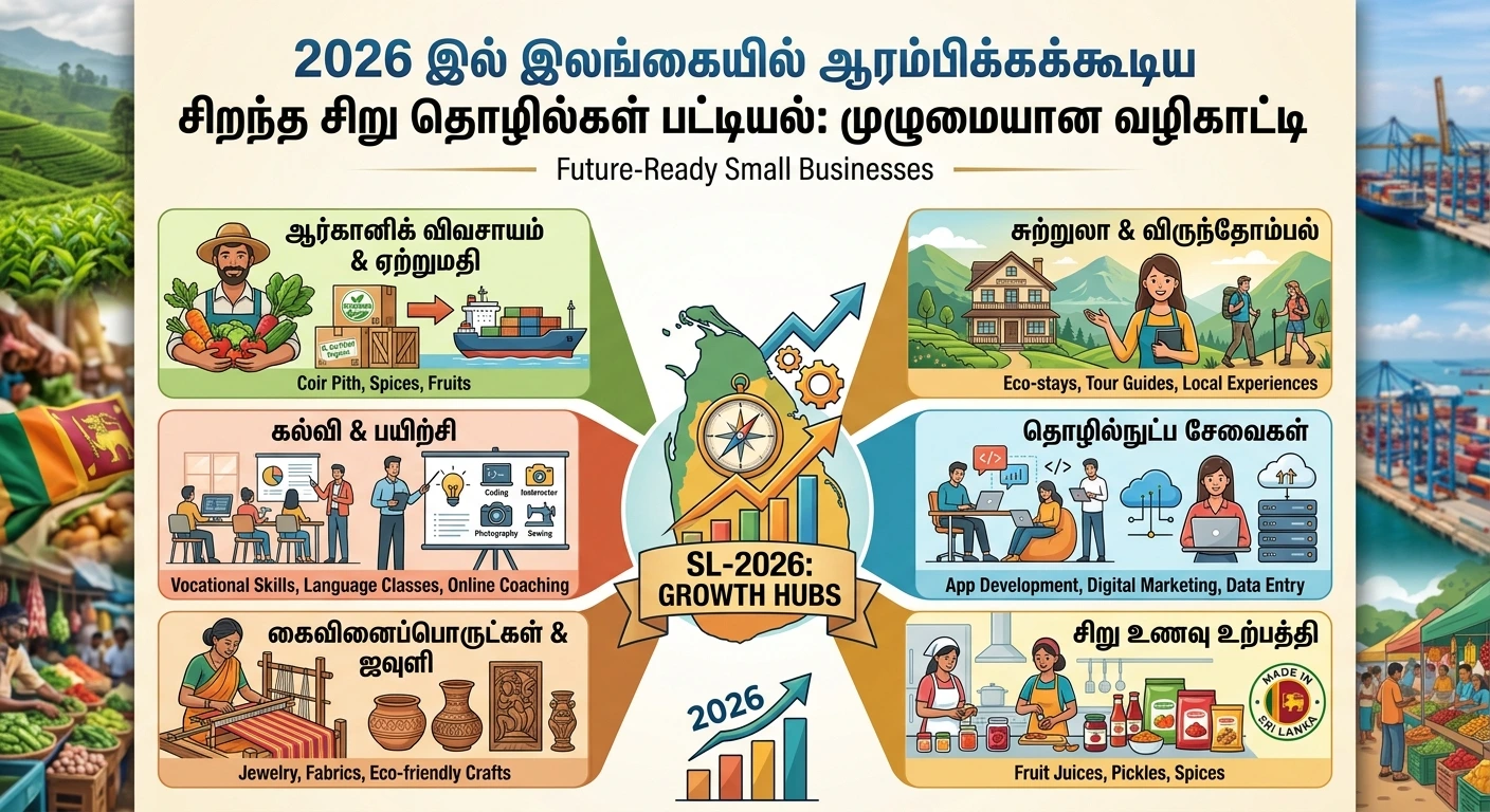 2026 க்கான இலங்கையின் சிறந்த சிறு தொழில்கள் பட்டியல் இங்கே. 20+ சிறு தொழில்கள் மற்றும் business opportunities in sri lanka பற்றிய முழுமையான வழிகாட்டி.
